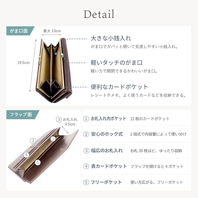 ブランド:RafiCaro(ラフィカロ) "オトナがカワイイ" がまぐち × 長財布 がまぐち長財布 カードポケット12枚 たっぷり入る 隅まで見渡せる 充実の収納力があんしん感。 大容量で気兼ねなく持ち運び。 [スペック] ・お札入れ/フリーポケット × 2 ・がまぐち小銭入れ × 1 ・カードポケット × 12 [推奨上限収納] ・お札 × 30枚 ・小銭 × 30枚 ・カード × 16枚