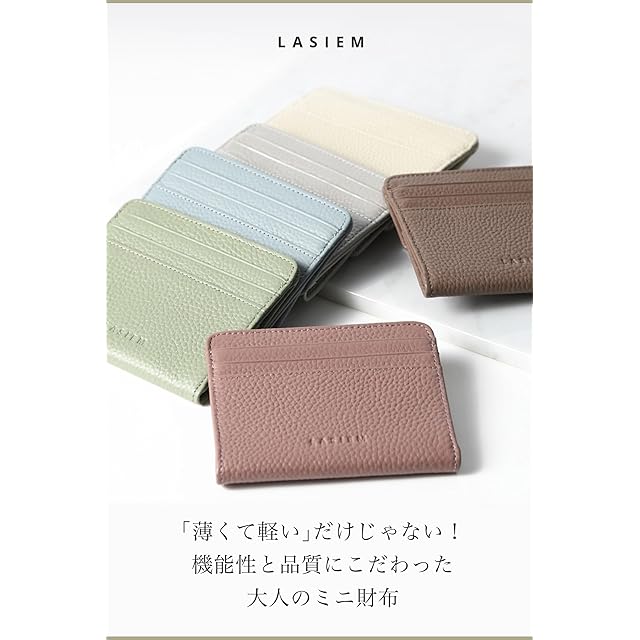【LASIEM(ラシエム)】ブランドの商品です。 【商品説明】 スマホより薄い!厚さ1cm以下の「極薄」ミニ財布 キャッシュレス決済が増えてきて、大きなお財布を持たなくてもいい生活に。 トレンドのミニバッグを持つときにも、大きなお財布は入らない… そんなお客様のお声からお作りした、「薄軽」ミニ財布の登場です。 ■カードを入れても厚さ1cm以下! ミニバッグに入れても邪魔にならない小ささ! 普段使いのお財布としてはもちろんですが、旅行、フェス、浴衣のときに、ランニングやウォーキングに、お仕事中に…二個持ちするのもおすすめです。 ■小さく見えて、収納力◎! カード、折りたたんだお札、小銭、常備薬…必要なものは全部入る収納力! キャッシュレス派も、現金派も、どちらの方にもお使いいただけます。 ■かさばらない、コンパクトサイズ ミニバッグにもおさまるコンパクトさ。普段使いとしてだけではなく、オケージョン使いにもおすすめです。ポケットに入れてもふくらまないのもポイントです。 ■使いやすさ抜群!ボックス型小銭入れ ガバっと大きく開くボックス型で、「取り出しやすい」「入れやすい」が叶います。隠しポケットをつけたので、お守りや常備薬、外した指輪などを入れておけます。 ■お札もカードも入る、4つのポケット 前面のカードポケットは3つ、真ん中のフリーポケットにはお札を二つ折りにして入れられます。 ファスナーを開く必要がないので、お会計がスムーズです。 ■安心して使える、スキミング防止機能 全てのポケットに、スキミング防止素材を使用しています。 大切なカードをスキミング犯罪から保護いたします。 ■大人にふさわしい、上質な牛本革 シボのある牛本革を厳選しました。傷がつきにくく、長くお使いいただけます。 ひとつのものを長く使うことで地球にも優しく、可愛いお財布で気分を上げて自分にも優しく!