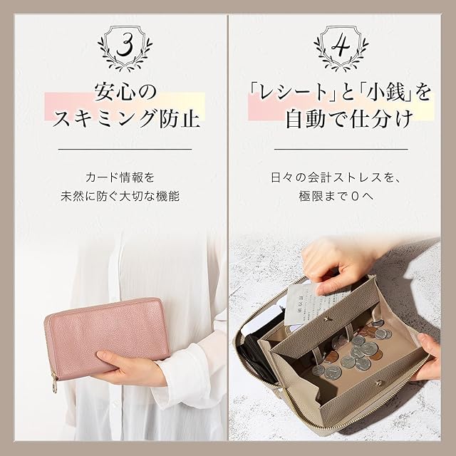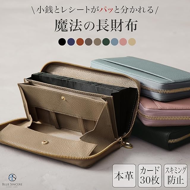 ✅【 ブルーシンシアとは? 】 「ブランドの発展とともに、バングラデシュの社会問題を解決する」という理念を掲げ、 バッグや財布を自社工場のバングラデシュの職人たちと、その土地の素材の可能性を追求し、 先進国でも通用する高機能なプロダクトを生産しています。 ✅【 使いやすさ抜群!大容量ギャルソンウォレット 】 「パッと見たときにすぐにカードを取り出せる」「容量も妥協しない、しっかりお札や小銭も入る財布を探している」そんなお声から、収納力を兼ね備えたじゃばらギャルソン長財布がBLUE SINCERE(ブルーシンシア)から登場しました。 従来のよくあるギャルソンウォレットとサイズはほぼ変わらないにも関わらず、財布の設計を見直したことによりカード収納ポケットを30枚に拡張。蛇腹式なのでサイフを開けたらパッと一目瞭然。 週末のデートや1泊2日の旅行から、フォーマルシーンなど色々な場面でこの財布をお使い頂くことができます。 収納力を持った財布をお探しのあなたにピッタリなサイフです。 ✅【 今の時代に欠かせないスキミング防止機能 】 近年急速にキャッシュレス化が進み、カードで支払いできるお店も増えてきて、カードでの支払いが主流になって来ました。 カードで簡単に支払いができる便利な世の中になった反面、スキミングという恐ろしい犯罪も増えて来ました。 スキミングとは、専用の機械を使って、クレジットカードやキャッシュカードなどの大切な情報を盗み取る犯罪です。 近づいただけで知らない間に大切なカード情報を盗み取られてしまう危険性があります。 そんな恐ろしいスキミングの被害からあなたを守るべく、スキミング防止機能を搭載しました。 特殊なフィルムを織り込むことで、外部からの電波をシャットアウトします。 カードをカードポケットに入れておくだけでスキミングの被害を防ぐことができます。大切なカード情報をしっかり守ります。