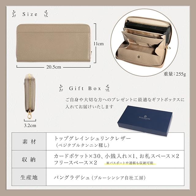 ✅【 サイズ 】縦20.5 × 横11 × 厚み3.2cm 【 重さ 】 約265g 【 収納力 】 カードポケット×30、お札スペース×2、フリースペース×2、小銭スペース×1 【 素材 】 牛本革 トップグレイン シュリンクレザー(植物タンニン鞣し) 【 カラー 】 ロイヤルブラック・グレージュ・レトロキャメル・ダークネイビー・ディープグリーン・スワニーピンク・スカイブルー・シャンパンゴールド