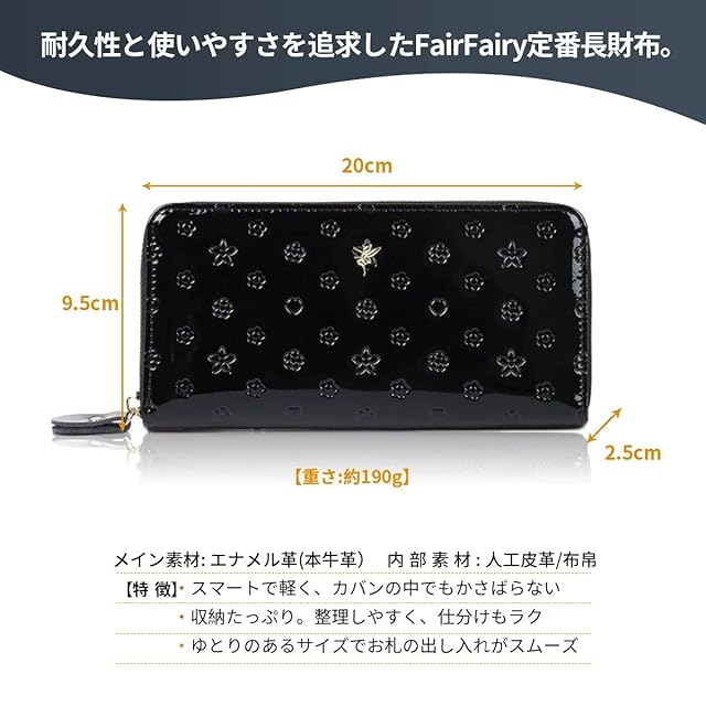 フェアーフェアリー 人気 の レディース 長財布 高品質なエナメル革を使用しています。丈夫でキズや汚れが付きにくい、耐久性に優れた 財布 です。 素材 外部:本牛革(エナメル加工・型押し加工) 内部:合皮+布帛 仕様: カード入れ×12 札入れ×2 伝票入れ×2 L字ファスナー式小銭入れ(中仕切り有り)×1 サイズ:20cm×10cm×2.5cm 重量:約190g