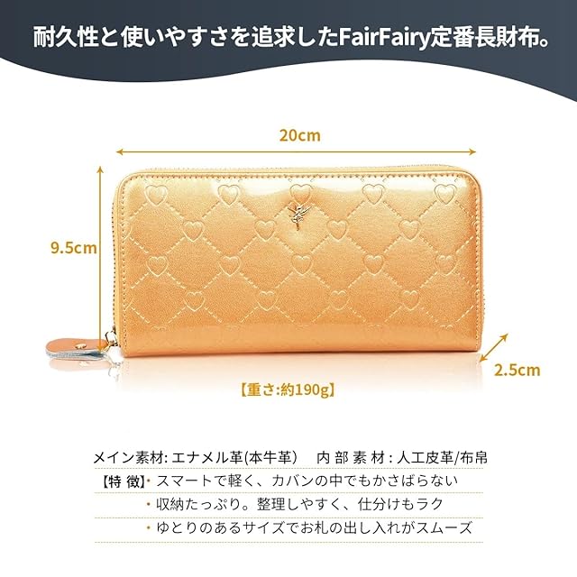 フェアーフェアリー 人気 の レディース 長財布 高品質なエナメル革を使用しています。丈夫でキズや汚れが付きにくい、耐久性に優れた 財布 です。 素材 外部:本牛革(エナメル加工・型押し加工) 内部:合皮+布帛 仕様: カード入れ×12 札入れ×2 伝票入れ×2 L字ファスナー式小銭入れ(中仕切り有り)×1 サイズ:20cm×10cm×2.5cm 重量:約190g