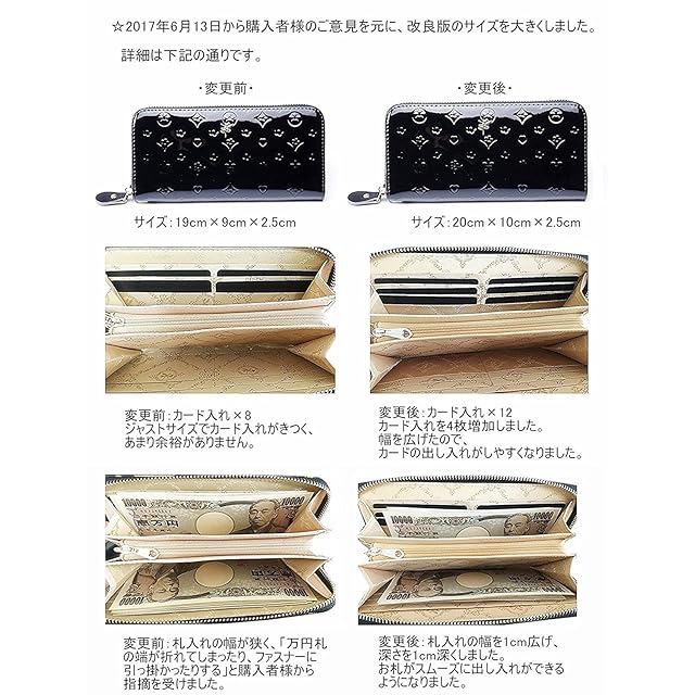 お札の収納時等、 出し入れの利便性を考えて財布の幅は20cmにしております。お札の端が折れて不便だというお客様の意見が多数ありましたのでサイズを見直しました。