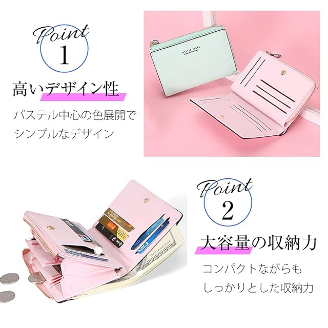 【使いやすい二つ折り財布】小銭入れ付きでスマートなフォルムの二つ折り財布です。ラウンドファスナータイプの小銭れは大きく開き、コインをとりだしやすくなっています。また仕切り付きで仕分けが可能です。<br> 【プレゼントにぴったり】シンプルなデザイン性と機能性を両立させた上品なミニ財布になり、普段使いやご自分へのご褒美に。また、女性の方へのプレゼントにも大変喜ばれます。 専用化粧箱付き。入学、卒業、就職などのお祝いや、誕生日、記念日、母の日、ホワイトデー、クリスマスなど、各種ギフトに最適です。<br> 【小さくて持ち運びに便利】コンパクトサイズで、流行りのミニバッグとの相性も抜群です。身軽なコーデのライブやフェス、着物姿の花火大会やお祭りなどの小さな布製バッグなどにもすっぽり収まります。<br> 【高いデザイン性】無駄のないすっきりとしたデザインの中にゴールドのパーツが女性らしい印象のアクセントになっています。また小銭入れを開けると、ハートのチャームが! こういう隠れたおしゃれは女性には嬉しい!!<br> 【扱いが楽】高品質なPUレザーを使用。撥水性があり、傷もつきにくく、ちょっとの汚れなら軽く拭くだけでキレイになりお手入れも簡単です。<br> 【高い収納力】合計10個のカードポケットが付いています。ほかに札入れ、小銭入れとコンパクトながらも長財布の代わりに十分対応可能です。