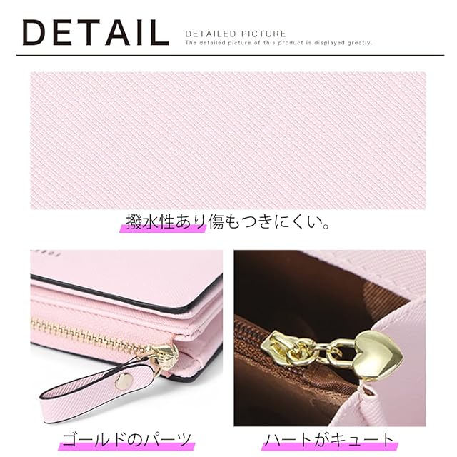 【使いやすい二つ折り財布】小銭入れ付きでスマートなフォルムの二つ折り財布です。ラウンドファスナータイプの小銭れは大きく開き、コインをとりだしやすくなっています。また仕切り付きで仕分けが可能です。<br> 【プレゼントにぴったり】シンプルなデザイン性と機能性を両立させた上品なミニ財布になり、普段使いやご自分へのご褒美に。また、女性の方へのプレゼントにも大変喜ばれます。 専用化粧箱付き。入学、卒業、就職などのお祝いや、誕生日、記念日、母の日、ホワイトデー、クリスマスなど、各種ギフトに最適です。<br> 【小さくて持ち運びに便利】コンパクトサイズで、流行りのミニバッグとの相性も抜群です。身軽なコーデのライブやフェス、着物姿の花火大会やお祭りなどの小さな布製バッグなどにもすっぽり収まります。<br> 【高いデザイン性】無駄のないすっきりとしたデザインの中にゴールドのパーツが女性らしい印象のアクセントになっています。また小銭入れを開けると、ハートのチャームが! こういう隠れたおしゃれは女性には嬉しい!!<br> 【扱いが楽】高品質なPUレザーを使用。撥水性があり、傷もつきにくく、ちょっとの汚れなら軽く拭くだけでキレイになりお手入れも簡単です。<br> 【高い収納力】合計10個のカードポケットが付いています。ほかに札入れ、小銭入れとコンパクトながらも長財布の代わりに十分対応可能です。