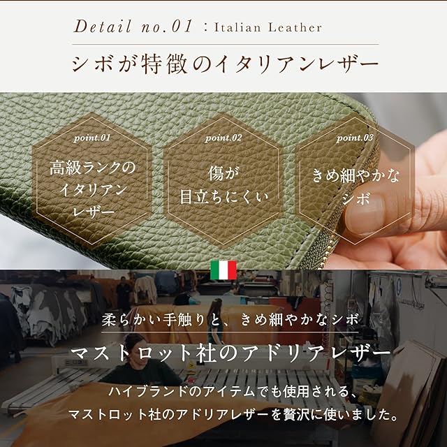 ✅【 高級ランクの高品質本革。イタリアンレザー長財布 】イタリアが誇るマストロット社、ハイブランドでも使用される高級ランクのイタリアンレザーを使用。職人たちが手間暇かけた上質で上品なくすみカラーのイタリアンレザーです。シュリンクレザー仕様で傷が目立ちにくく、優しい手触りに美しいシボレザー。内側はハイブランドでも使用される高級ゴートレザー(ヤギ革)で丈夫で柔らかいレザーです。