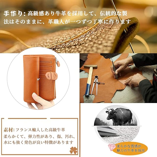 【美しい本革】この二つ折り財布は上質な本革を採用されて、高級感あふれる、手触りが非常に柔らかくフィット感抜群、傷やカジリを防ぐことが出来ます。また、柔軟性、通気性を揃った素材を持っておりますので、長い時間でも使用できます。本製品は天然の牛革で製作され、革の特殊の匂いが付いています。新品は厳密な包装があり、空気の流通がよくないので、匂いが散らしにくくなります。暫くの間で使用した後、匂いがだんだん消えていきます。