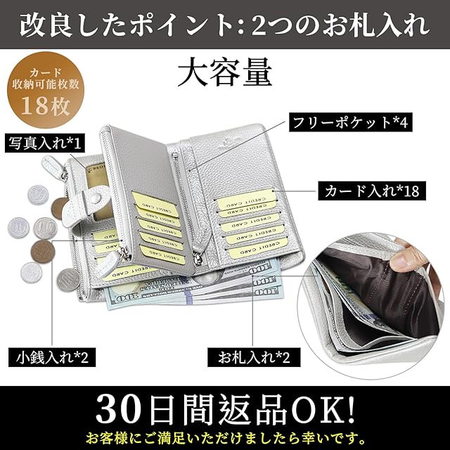 商品名:《新品未開封》[F.ZH] 二つ折り財布 レディース 短財布 本革製 小銭入れ付 18カード入れ お札入れ 大容量 小型 軽量 多機能 ダブルボタン ダブルファスナー クリスマス 母の日プレゼント 自分用もプレゼント用も最適… (シルバー)