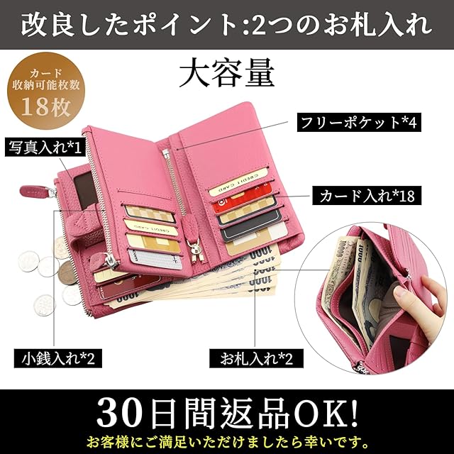 【収納力が優れる】毎日この二つ折り財布を使う必要があるから、収納力もお求めのポイントです。ファスナー付きポケット(小銭入れ)×2、カード用ポケット×18、フリーポケット×4、札入れ×2、写真入れ×1 が合計27箇所、その他、写真いれ、小銭いれ付き、外側のファスナーを開けるとコインや切符などが入る嬉しいミニ収納付き。沢山なカード、レシート、現金、小銭、切符、免許、携帯をスッキリ収納できます。 必要なものが全て持ち運べて、とても便利です。