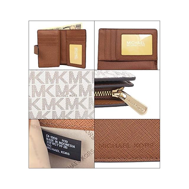 【2019 秋冬 モデル】マイケルコース MICHAEL KORSの財布(二つ折り財布)です。ホワイトのPVCコーディングキャンバスのシグネチャー柄にブラウンのレザー、フロントのロゴ金具がエレガントな二つ折り財布です。ホックベルト開閉でカードポケットやパスケース、L字ファスナーの間仕切り付き小銭入れとコンパクトながら収納力も機能性も高く、セカンド財布としても重宝します。プレゼントにもオススメです!