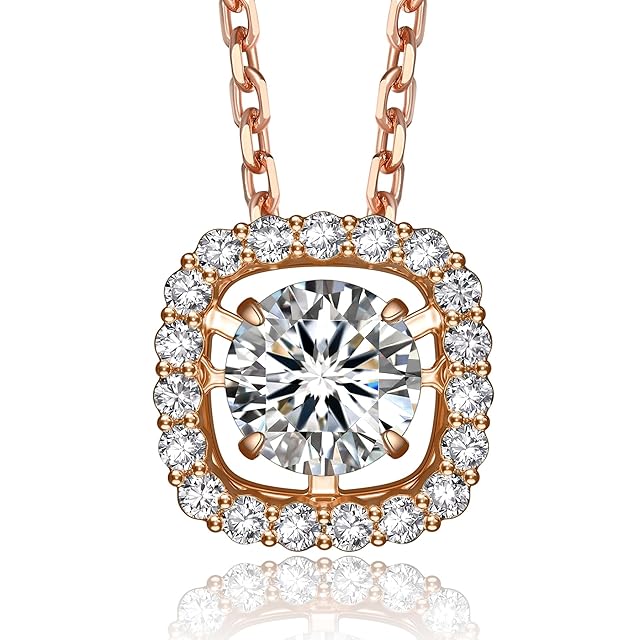 ダンシングストーン:浮いたデザインのスクエアペンダントが、鼓動や微風に合わせて優雅に揺れます。中心の5mm/6.5mmモアサナイト(0.5ct/1ct)を19粒の1.2mm/1.5mmモアサナイトが同心円状に取り囲み、立体的な輝きを生み出します。主石の揺れに合わせて周囲の细石が光を反射し、動的な美しさを演出します