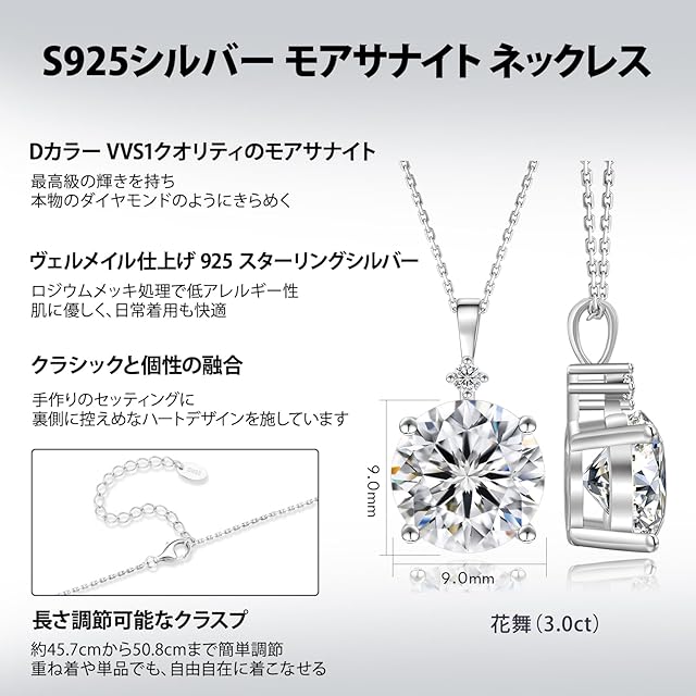 商品名:《新品未開封》[KRKC] モアサナイト ネックレスレディース:誕生日プレゼント女性 S925スターリングシルバー 一粒ダイヤ 0.5/1.0/2.0/3.0/4.0ct 人工ダイヤモンド 4本爪 金属アレルギー対応 ホワイトゴールドメッキ シンプル 人気 ギフトボックス付き チェーン可調節45+5cm(花舞-3.0ct)