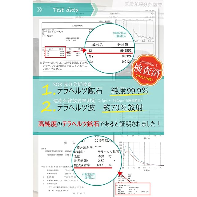 【公的機関で検査しました】偽物や低品質の安価なテラヘルツ鉱石も出回っておりますが、公的機関にて何度も検査し、テラヘルツ鉱石の純度約99%、テラヘルツ波の放射率70%を確認しております。皆様に安心して本物のテラヘルツ鉱石を体感して頂ければと思っております。