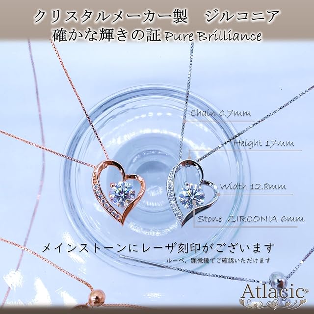 クリスタルメーカー製高級ジルコニア採用、ジルコニア表面にレーザー刻印がございます。大切な人へのプレゼントとして最も支持されるオープンハートデザイン。やわらかい曲線の立体ハートモチーフに、8粒の宝石が美しく首元を飾りす。非対称のハートモチーフは甘くなりすぎず、素敵な女性を演出します