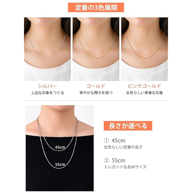 [チェーンネックレス] 大人気のチェーンネックレスです。幅は1mmで、チェーンの長さは45cm、55cmの2種類をお選びいただけます。アジャスターが付いているので、+5cmの間でお好みの長さに調節ができます。