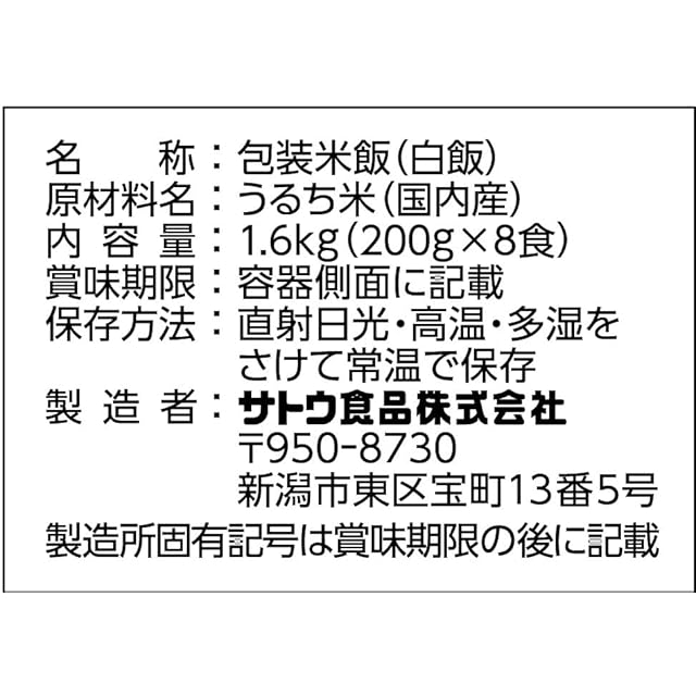 商品名:《新品未開封》サトウ 新潟県産コシヒカリ 200g×8食パック