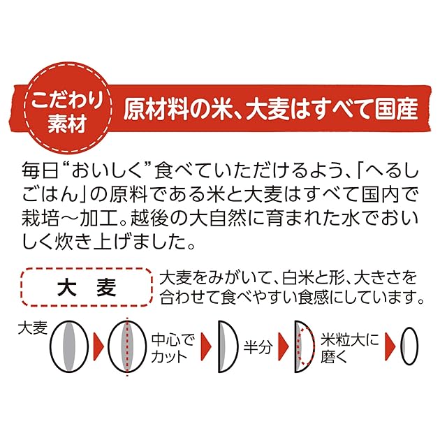 高アミロース米(白米の品種)、白米、大麦(大麦をみがいて、白米と同じ形、大きさをあわせて食べやすい食感)の3種をブレンドした炊飯パック米。カロリー35%オフ、糖質36%オフ、1食あたり食物繊維4.2g。※日本食品標準分析表 2015年度版(七訂)精白米との比較。電子レンジで約2分、お湯で約10分簡単調理。