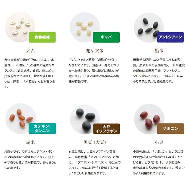 原材料:うるち米・もちあわ・黒米・黒豆(大豆)・アマランサス・発芽玄米・キヌア・たかきび・小豆・黒ごま・白ごま・もちきび・大麦・赤米・ひえ・はと麦・とうもろこし