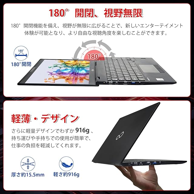 【薄型・軽量デザイン】富士通 軽量ノートパソコン わずか約916gの驚くべき軽さと15.5mmの薄さを実現/国内メーカー富士通が誇る堅牢なマグネシウム合金ボディ。スタイリッシュなデザインと軽量設計で、持ち運びもラクラク。出張や通勤、学校への持ち運びにも最適です。
