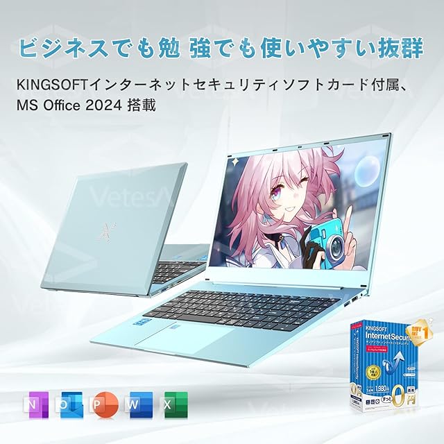 VETESA Office 2024搭載 ノートパソコン 15.6 イン 1920×1080 IPS液晶Win11 Pro 92万画素WEBカメラ 薄型ノートPC 第12世代Intel-N95/メモリ16GB/SSD 512GB/Wi-Fi5 対応 ラップトップ Mini HDMIポート/USB 3.0/USB 2.0・ オンライン授業・在宅勤務・ビデオ鑑賞 10キー/指紋認証機能搭載 無線マウス付属<br><br>OS :Windows11Pro<br>Office: MS Office 2024(Word,Excel,Powerpoint,Outlook,OneNote)搭載<br>ソフト: 一億人愛用のKINGSOFTインターネットセキュリティソフトカード付属<br>CPU: 第12世代Intel-N95 , 4コア<br>GPU:インテル HD グラフィックス <br>ストレージ :内置:DDR4 16GB +512GB 高速SSD/DDR4 32GB +1TB 高速SSD<br>液晶サイズ:15.6インチ<br>液晶解像度:1920x1080 FULL HD IPS ディスプレイ(1080P)<br>豊富な接続端子:USB 3.0、USB 2.0、miniHDMIポート、マイクロホン/イヤホン出力端子。<br>無線通信:WiFi5.0/Bluetoothに対応します<br>マイク:搭載<br>カメラ:92万画像<br>バッテリー:5000mAh<br>日本語キーボード:キーボードフィルム付き/ 10キー/指紋認証機能搭載。