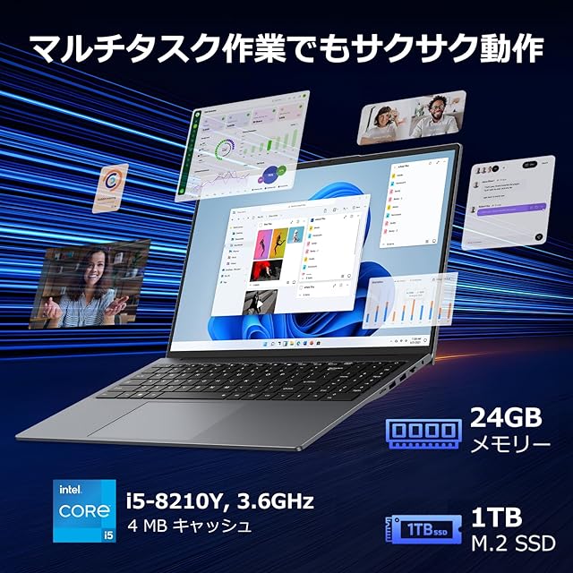 圧倒的処理速度:このノートパソコンはインテル 第8世代Core i5 プロセッサー を搭載(最大 3.60 GHz までブースト可能)、デュアルコア/クアッドスレッド設計により、日常業務(メール、ウェブブラウジング、オフィスアプリケーション)やマルチタスキングをスムーズに処理。24GB 大容量 RAM が複数のアプリケーション同時実行をサポート、1TB SSD(読み取り速度520MB/s)でOS起動9秒を実現、レスポンスを向上させます;鮮明な視覚体験:16型FHD IPS広視野角ディスプレイ;1920×1200解像度(一般HD比+125%画素密度)+IPSパネル搭載で、角度による色偏移を5%以下に抑制。72% NTSCカバー率を実現し、動画再生や資料作成時の色彩精度を確保。従来の15.6型画面と比較して縦方向の表示領域が約2行目拡大され、作業効率を向上させるノートpcです;パワフルな拡張性:デュアルバンドWi-Fi(2.4GHz/5GHz)+BT5.0で最大1.7Gbps通信(802.11ac比2倍高速)。HDポート / USB3.0×3 / Type-C / Micro SDスロットを完備し、4Kモニターと外付けSSDの同時接続が可能。ビジネス向けノートパソコン:Win 11 ProとOffice 搭載。Word、Excel、PowerPointなど仕事に不可欠なソフトすべて事前インストールされ、即時業務開始可能;軽量薄型持ち運び易いノートpc:約 1.7kg の軽量ボディ(ネット重量)と 20mm のスリムな厚み(357.5 x 245 x 20 mm)で、持ち運びに便利。外出先やオフィス間の移動にも負担になりません。快適なタイピング環境: バックライト付き US英語キーボード を採用。暗い環境でもキーが見やすく、快適な入力作業をサポートします。キートップには耐久性に優れたシルク印刷を施しています。また、便利なテンキーを備えて、数字入力をより快適に。高精度Web会議:100万画素カメラ&デュアルマイク、HD解像度カメラ(720p対応)で、オンライン授業/Zoom会議の映像・音声をクリアに伝送。