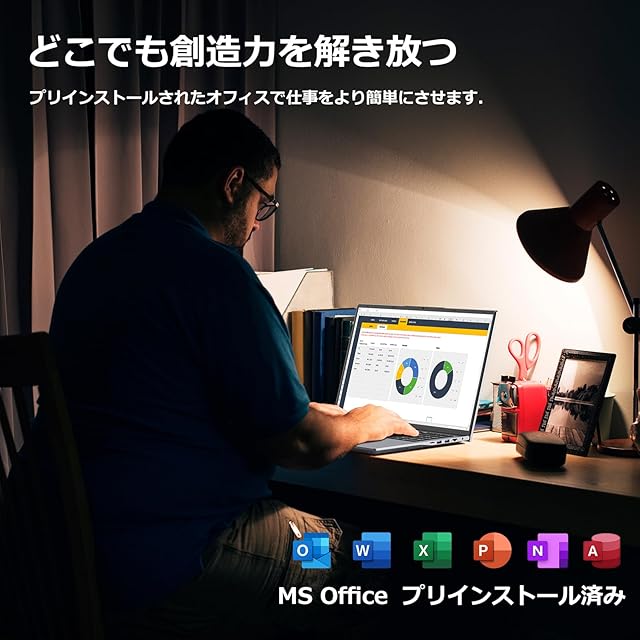 ビジネス向けノートパソコン:Win 11 ProとOffice 搭載。Word、Excel、PowerPointなど仕事に不可欠なソフトすべて事前インストールされ、即時業務開始可能