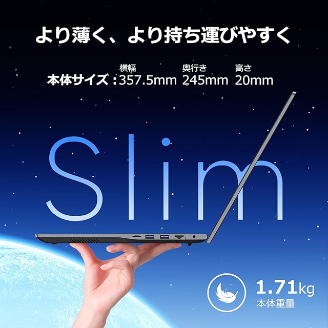 軽量薄型 持ち運び易いノートpc:約 1.7kg の軽量ボディ(ネット重量)と 20mm のスリムな厚み(357.5 x 245 x 20 mm)で、持ち運びに便利。外出先やオフィス間の移動にも負担になりません