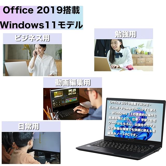 ⑤ Windows 11 & Office 2019搭載で届いてすぐ使える 最新のWindows 11 Pro 64bitをセットアップ済み。さらにMicrosoft Office 2019(Word、Excel、PowerPointなど)もインストール済みで、到着後すぐに仕事や学習にご利用いただけます。