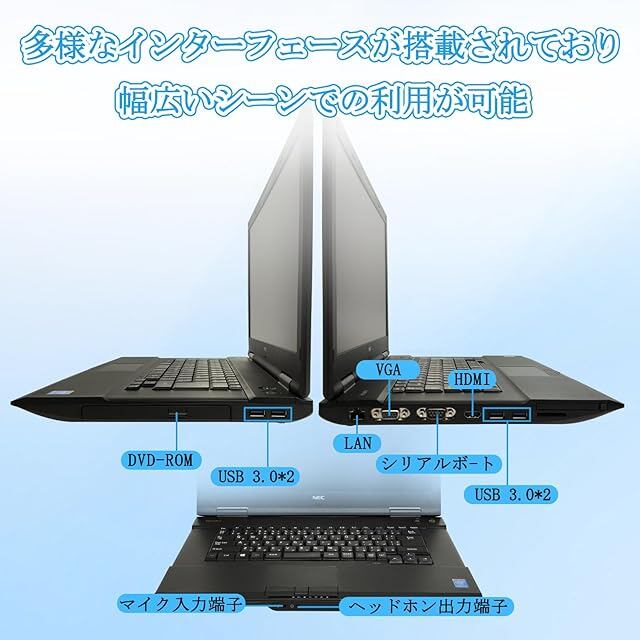【充実したインターフェースで幅広く活躍】 HDMI/VGAで外部モニター接続可能。DVD-ROMも搭載しており、古い資料の閲覧やCD再生にも対応。WiFiと有線LAN両対応で、安定した通信環境も実現します。プレゼンや家庭用、学習用にも多用途に対応します。