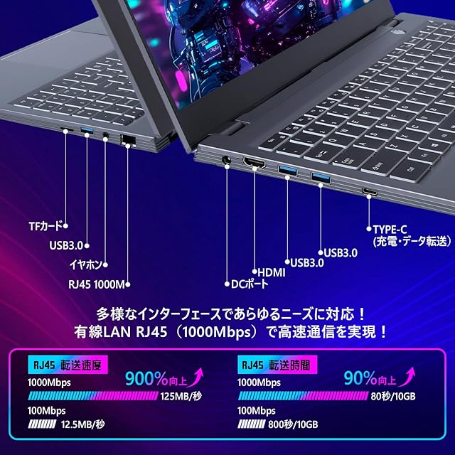 ✅ 【多機能インターフェース&持ち運びやすいデザイン】 USB3.0×3、Type-C、HDMI、RJ45有線LANポート搭載で、様々なデバイスと接続可能。指紋認証センサー付きでセキュリティ強化。アルミ合金ボディの軽量薄型ノートパソコン(1.75kg、35.8x23.8x18cm、最薄0.9cm)は、リモートワークPC・在宅ワークPCとしても理想的な1台。