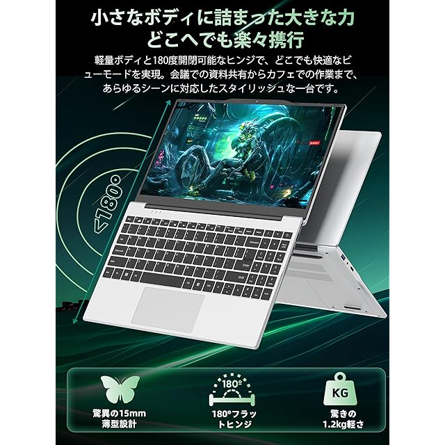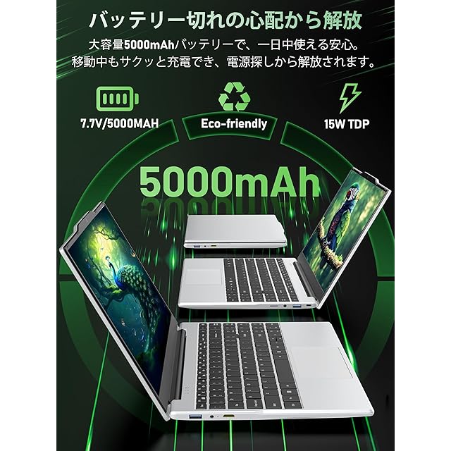 【薄型・超軽量・便利ノートPC&超大容量バッテリー搭載】 ノートパソコンの重量約1.5Kg、薄型で持ち運びに負担を減らせます!小さなカバンやハンドバッグにも収納できるビジネスやプライベートの外出先での使用など、コンパクトで持ち運びなので、外出時に携帯しても身体に負担がかからない。34Whの大容量バッテリー、長時間の駆動を実現し、オフィス作業やエンターテインメントに便利です。数字入力がしやすいテンキーも搭載して会計処理、事務作業、家計薄、レポート作成などのスピートを大幅アップ。5000mAhバッテリーを内蔵、4-6時間連続使用することができます。外出先や移動中でも充実した使用体験が得られます。電源アダプタ12V-3A,PSE認证を取得。