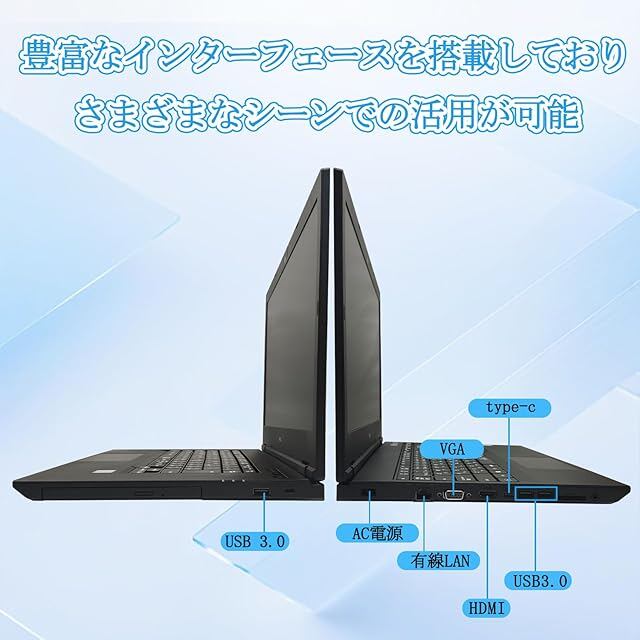【充実の基本機能】 15.6型大画面、DVD-ROMドライブ、Webカメラ、内蔵無線LAN、Bluetooth、HDMI、Type-C など豊富なポートで多様なニーズに対応。