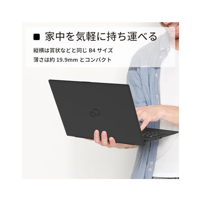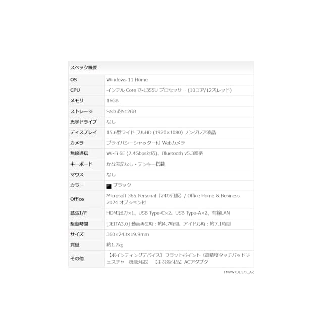 外形寸法(幅×奥行×高さ)(突起部含まず):360×243×19.9mm / 本体質量(バッテリーパック含む):約1.7kg / バッテリ駆動時間:<動画再生時>約4.7時間(JEITA 3.0)、<アイドル時>約7.1時間(JEITA 3.0) / カラー:ブラック / ホームノートパソコン / Microsoft 365 Personal(Office Home & Business 2024 オプション付)