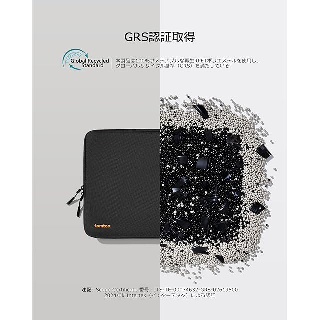 【サステナビリティと品質の融合】 GRS認証(グローバル・リサイクル・スタンダード)を取得したこのノートパソコンケースは、環境に優しい素材と優れたクラフトマンシップを兼ね備えています。撥水加工されたリサイクル生地を使用し、安心のYKKジッパーと柔らかな裏生地が特徴です。何百万本もの廃棄されたプラスチックボトルを再利用して、耐久性と高い機能性を実現したデザインです。tomtoc製品は全て12ヶ月間安心付きます。