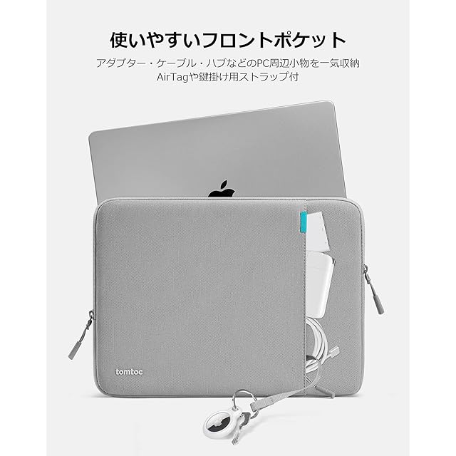 【使いやすいフロントポケット】パソコン以外も持ち回る必需品が必ずあります。ジッパー型フロントポケットはKindle、アダプター、ケーブル、マウス、ハブ、USBメモリ、イヤホンなどのPC周辺小物を一気に収納できます。AirTagや鍵掛け用ストラップ付。この軽量でコンパクトなラップトップ保護ケースは他のショルダーバッグ、バックパックに簡単に収納できます。