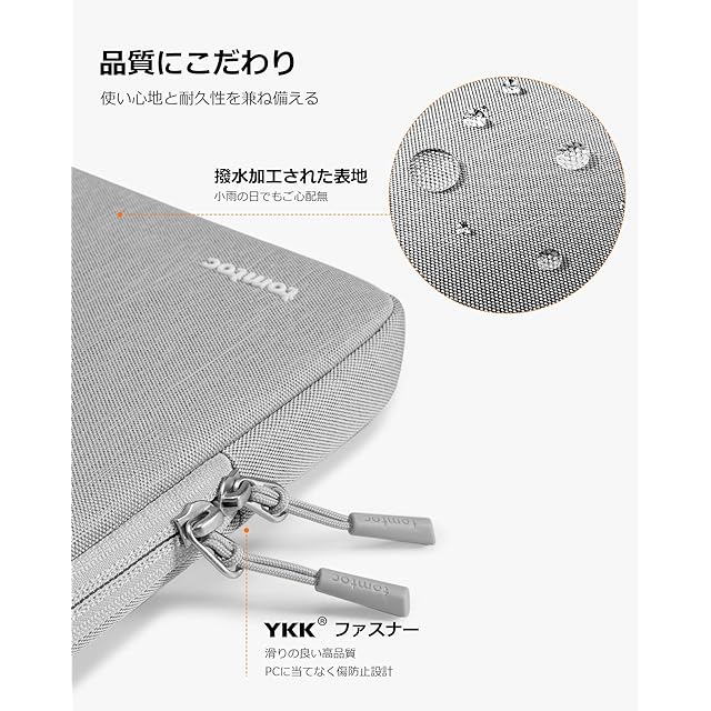 tomtocノートパソコンケース</br> 【軍用レベルのCornerArmor保護】</br> ケース全ての4隅に、新世代の特許取得の「CornerArmor」ガードが装備され、軍用レベルの落下テストをクリアした超強耐衝撃力でエアバッグのようにご貴重なノートPCを落下・衝撃などぶつかることから全方面丸ごと守ります。(落下テスト規格:MIL-STD-810H:2019)</br> 【360° 全面保護】</br> 内部は厚くふわふわとしたフランネル起毛生地の採用に加え、tomtocパソコンケースの統一なデザインとして、中はラインが並んでいる模様に設計され、洗練されて整然とした見た目でながら耐衝撃にも役立ちます。ジッパー周りの厚手高弾性エッジにより、ノートPCがジッパーに当てて、傷付くことを防げます。</br> 【品質や環境保護への取組み】</br> 安心のYKK製両開きファスナーを使用し、耐用性に優れて、開閉もよりスムーズで使いやすいです。表地は撥水加工された、PETボトルなどのプラスチックをリサイクルしてから作ったエコ素材を採用。プラスチックの再生利用により環境汚染の減少に取り組んでおります。tomtoc製品は12ヶ月間安心付きます。</br> 【便利な小物ポケット】</br> フロントポケットはKindle、アダプター、ケーブル、バウス、ハブ、USBメモリ、イヤホンなどのPC周辺小物を一気に収納できます。AirTagや鍵掛け用ストラップ付。</br>【ピッタリフィット】</br>外寸:375×265×32mm、内寸:356×248×22mm。16インチ MacBook Pro M4/M3/M2/M1 Pro/Max 2024-2019 (モデルA3403 A3186 A2991 A2780 A2485 A2141)にピッタリ対応。15.6-16.0型 富士通 FMV Lifebook AHシリーズ 2024-2025発売モデル、15.6型 HP15、Lenovo ThinkPad E16 Gen 2、NEC LAVIE Direct N15 Slim モデルにも対応。対応型番の詳細は下記ページでご確認の上お買い上げください。他のラップトップに対応できるかのにお迷う場合、お気軽にお問い合わせください。