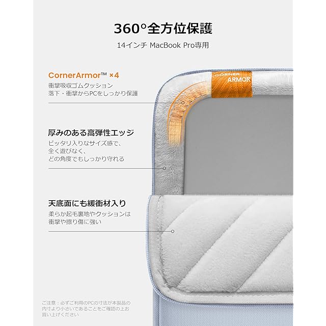 tomtoc Defender-A13 360度保護パソコンケース</br> 【軍用レベルのCornerArmor保護】</br> ケース全ての4隅に、新世代の特許取得の「CornerArmor」ガードが装備され、軍用レベルの落下テストをクリアした超強耐衝撃力でエアバッグのようにご貴重なノートPCを落下・衝撃などぶつかることから全方面丸ごと守ります。(落下テスト規格:MIL-STD-810H:2019)</br> 【360° 全面保護】</br> 内部は厚くふわふわとしたフランネル起毛生地の採用に加え、tomtocパソコンケースの統一なデザインとして、中はラインが並んでいる模様に設計され、洗練されて整然とした見た目でながら耐衝撃にも役立ちます。ジッパー周りの厚手高弾性エッジにより、ノートPCがジッパーに当てて、傷付くことを防げます。</br> 【品質や環境保護への取組み】</br> 安心のYKK製両開きファスナーを使用し、耐用性に優れて、開閉もよりスムーズで使いやすいです。表地は撥水加工された、PETボトルなどのプラスチックをリサイクルしてから作ったエコ素材を採用。プラスチックの再生利用により環境汚染の減少に取り組んでおります。tomtoc製品は12ヶ月間安心付きます。</br> 【便利な小物ポケット】</br> フロントポケットはKindle、アダプター、ケーブル、バウス、ハブ、USBメモリ、イヤホンなどのPC周辺小物を一気に収納できます。AirTagや鍵掛け用ストラップ付。</br>【ピッタリフィット】内寸:314 × 223 × 22mm。14インチ MacBook Pro M5/M4/M3/M2/M1 Pro/Max モデルA3434 A3112 A3401 A3185 A2992 A2918 A2779 A2442 2025-2021専用ケース。13.8インチ Surface Laptop 7 Copilot+ PC 2024 、ThinkPad E14 Gen 6 / ThinkBook 14 Gen 7、Dell Inspiron 14 14型、14型 NEC LAVIE NEXTREME Carbonにも対応。必ずご利用のPCの寸法が本製品の内寸より小さいであることをご確認の上お買い上げください。他のラップトップが入るかのにお迷う場合、お気軽にお問い合わせください。