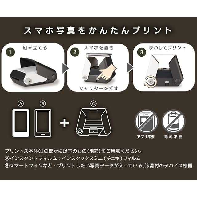 電源やインク、アプリは一切不要。スマホとフィルムとプリントスさえあればプリント可能