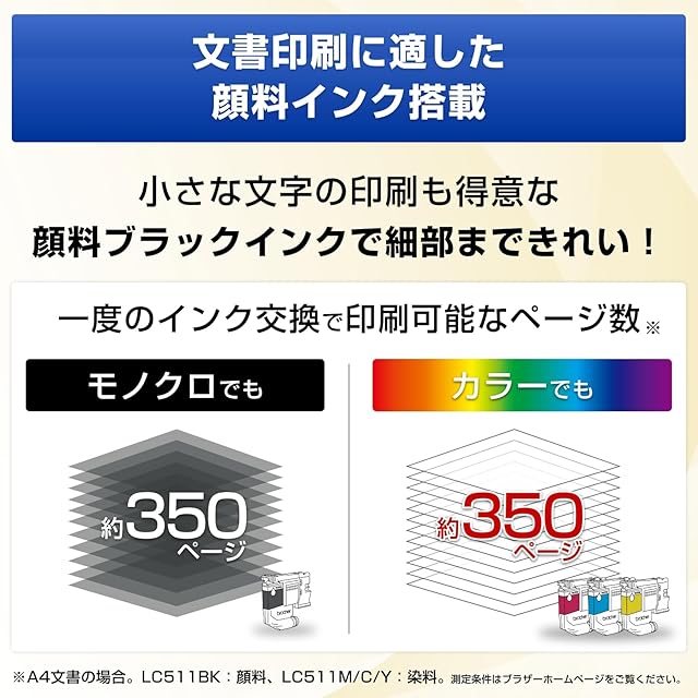 対応インク:LC511BK/LC511C/LC511M/LC511Y、インターフェイス:USB、無線LAN、Wi-Fi Direct対応、ダイレクトプリント:スマホ/タブレット接続 ※スマホ/タブレットにて使用する場合、専用アプリのインストールが必要です。 ※USBフラッシュメモリーは非対応です。