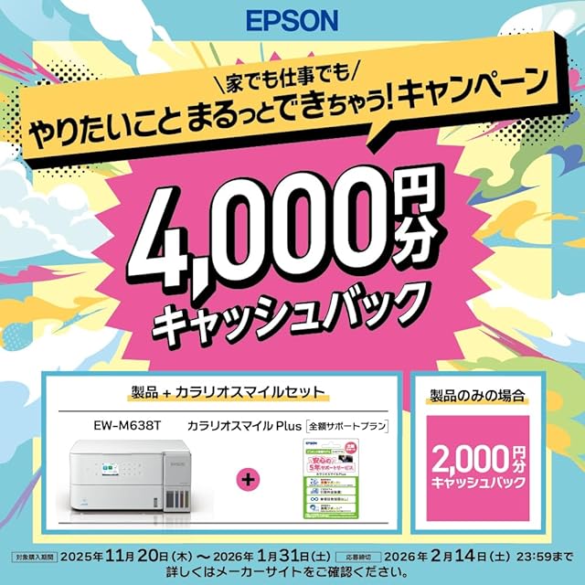 商品名:《新品未開封》【キャッシュバックキャンペーン実施中】【NEW】エプソン プリンター エコタンク搭載 A4カラーインクジェット複合機 EW-M638T 無線・有線LAN 前面給紙 在宅学習 テレワーク 自動両面印刷 2025年モデル