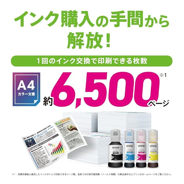 大容量インクタンク搭載で、気軽にジャンジャンプリントできます。インクボトルの追加購入で1回交換すれば、A4カラー文書を約6,500ページプリントが可能です。