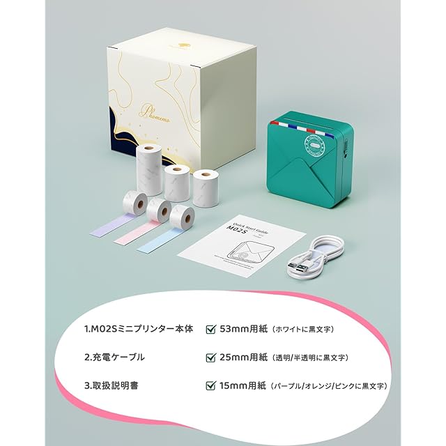 [多サイズ対応]M02S スマホプリンターは15mm・25mm・53mm の感熱紙とテープに対応し、用途を幅広くカバーします。学習ノート、フラッシュカード、図形図の印刷はもちろん、整理収納用ラベル、手帳装飾、年賀状、はがき、家計簿、オフィス文書など、日常のさまざまな場面で活用できます。約 40 カラーの感熱ロール紙から選べ、オリジナルステッカーを作れます
