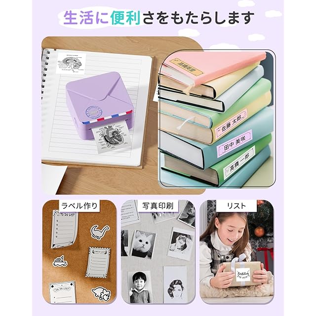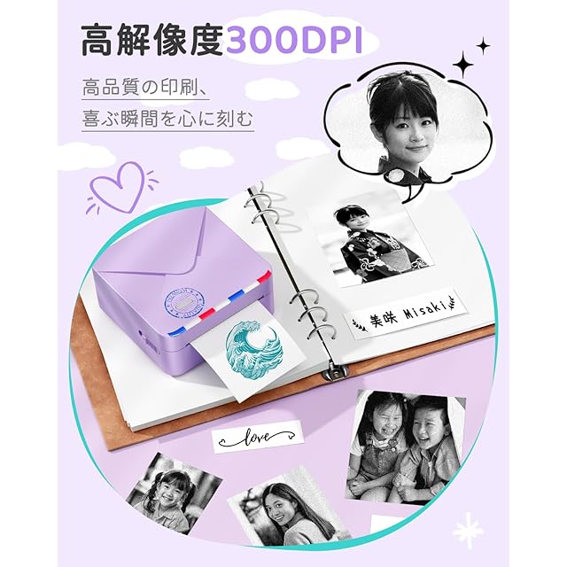 高解像度:300DPIの解像度を持つ日本製プリントヘッドを内蔵し、クリアで綺麗な印刷効果を提供します。新しい画像とテキストの印刷エクスペリエンスをもたらし、白黒写真の印刷では、会議後にメモを取るのに適しています。写真、メモ、付箋、作業計画、会議メモなどに使用できます