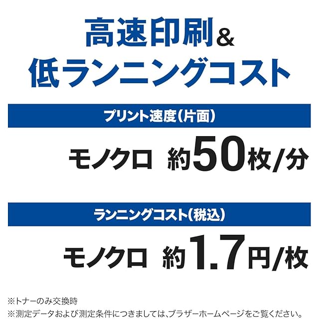 プリント速度(片面):モノクロ約50枚/分。製品寿命:約60万ページまたは7年のいずれか早い方