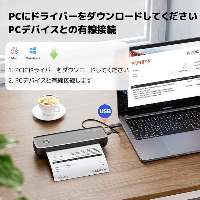 24ヶ月期間と最速のアフターサービス:MUNBYNは100%の顧客満足度を目指しています。操作動画、印刷のヒント、ラインおよびパソコンによるリモートヘルプを年中無休で提供しており、迅速に応答いたします。本製品を使用する前または使用した後にご質問があれば、直接お問い合わせください。注意:Macbookに本製品を接続する場合は、同梱のデータケーブルおよびUSB CからUSB Aへの変換アダプターまたはドッキングステーションを使用する必要があります。また、電子説明書(付属品は日本語の説明書ある)または公式ウェブサイトからドライバーをダウンロードできます。