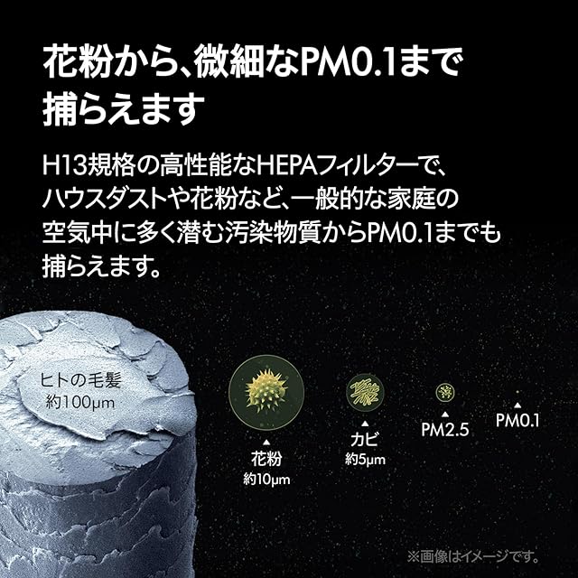 【HEPAフィルター】密閉性の高いグラスHEPAフィルターが、PM 0.1レベルの微細な粒子を99.95%除去します¹。活性炭フィルターが有害なガスやニオイを除去します²。
