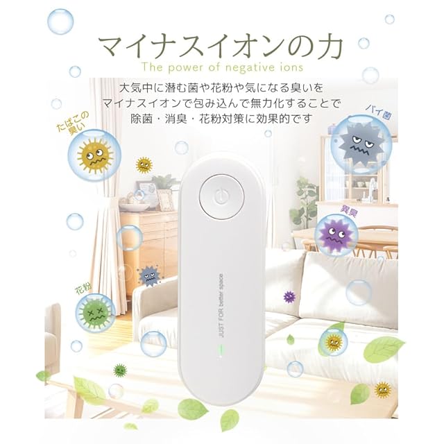 商品説明 このミニ空気清浄機は内部でマイナスイオンを生成して1秒間で約2000万ものマイナスイオンを放出します。マイナスイオンが空気中に漂う臭いの元やウイルスや花粉やホコリを吸着させて降下することで空気の清浄(消臭/脱臭)になります。 使い方はコンセントに挿してスイッチを押すだけの簡単設計。フィルター交換の必要もなく長時間使用できます。おしゃれなナチュラルカラーでお部屋の雰囲気を活かして設置可能です。また、日本語説明書もしっかり付属しています。 サイズ:約W3.5×D4.5×H11cm 重量:約56g 電源:AC100V 50/60Hz 消費電力:0.4W 電気代:約0.2878円/ 1日 ※1kWh 単価を30円と仮定して24時間使用した場合の金額です。 ※電気代はお客様の電気契約料金により異なります。 有効範囲:約5~10平方メートル(約2~5畳) 主材質:ABS 寿命:連続使用した場合:約1年 製造元:中国