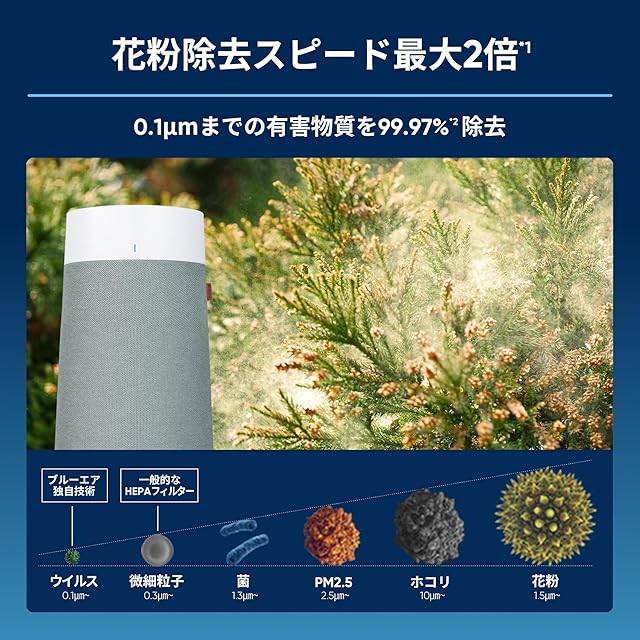 ✅【花粉除去スピード】帰宅時の衣類や外に干した洗濯物、窓を開けて換気することによって花粉は室内に一気に入ってきます。家の中で花粉によるアレルギー症状に悩まないためには、侵入してしまった花粉はできるだけ素早く除去することが大切です。 ブルーエアのBlue Max 3250シリーズなら、部屋中に舞ってしまった気になる花粉を約2倍*1のスピードで素早く確実に除去します。
