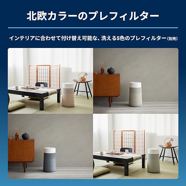 ✅【Design-デザイン-】本体の上部にいくほど寸法を小さくする「テーパリング」の手法を用い、商品をより背が高く、すらりとした印象に見せています。同時に、しっかりと地面に立つことで、製品がより頑丈で強靭に見える効果も得られます。360°全方向から吸引するデザインなので、場所の制約を受けず、お部屋のどこに置いてもパフォーマンスを損なうことなく使用できます。また、お部屋に溶け込むシックな北欧カラーのプレフィルターを5色ご用意しました。インテリアや気分に合わせてコーディネートを楽しんでいただけます。本体ご購入時には、Stockholm Fog Grey が装着されています。