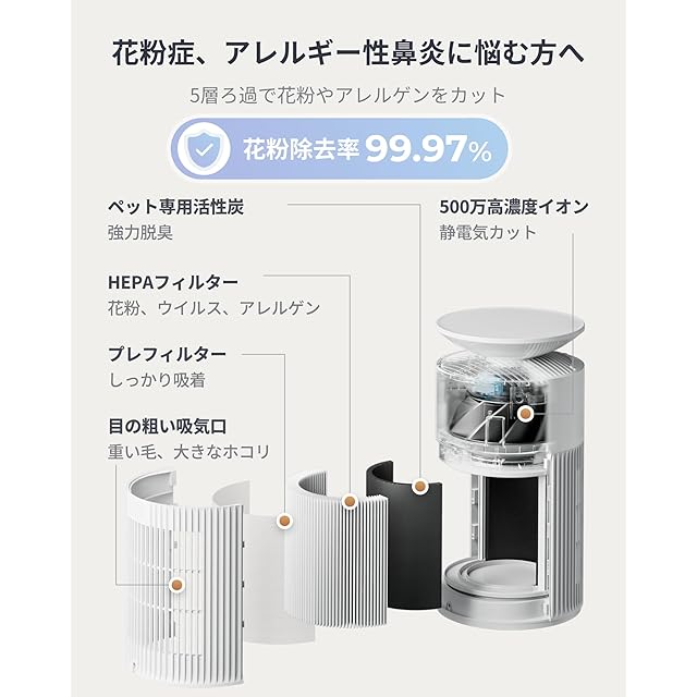 【5層構造の強力な浄化システム】360°全方向型の吸気口で、ペットの重たく分厚い毛でも詰まらず素早く吸気。プレフィルターが吸い込んだ毛をしっかりと吸着し、HEPAフィルターで花粉やアレルゲンなどを効果的にカットします。ペット専用の活性炭や、500万高濃度イオンによって、キツイ異臭も強力に脱臭し、静電気もカット。鼻炎やアレルギー性皮膚炎に悩む方にもおすすめです。